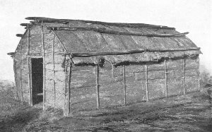 Early whites saw long houses that were "fifty or sixty yards long by twelve wide with a passage ten or twelve feet long down the middle." number of fires they contained. Each fire added twenty or twenty-five feet to the length of a cabin and they did not exceed thirty or forty feet. A typical town might have fifty of such dwellings and one was said to have two hundred. The towns were surrounded by a ditch, rampart and stockade so strong the English used to call them castles. Each rested on four posts for each fire which were the base and support of the entire structure. Around the entire circumference, that is the two sides and the two gable ends, pickets were planted to secure pieces of elm bark wich formed the walls and which were bound together with strips made from the interior coating or inner bark of white wood. The roof framing was made with poles bent to form a bow which were covered with pieces of bark. These pieces overlapped like slate. Inside the middle space was always the place of the fire from which the smoke escaped through an opening made directly above it in the roof which served also to provide light since there were no windows. Movable pieces of bark were used to cover the hole during heavy rains.