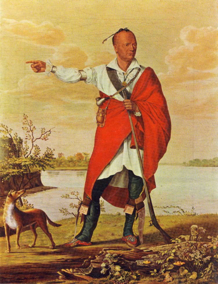 Thayendanegea, Chief of the Six Nations, wisely warned his people to foster Thayendanegea, "he sets or places together two bets," [*] was born in the spring of 1742 in what today is Ohio on the banks of the Muskingum River. His father, a prominent warrior, died when his son was an infant. Joseph Brant, his English name, became a figure of distinction, a remarkable man. The young Mohawk was educated in English at a school in Lebanon, Connecticut under the tutelege of Dr. Eleazar Wheelock, the founder of Dartmouth College. Described by his teacher as being "of a sprightly genius, a manly and genteel deportment, and of a modest and benevolent temper, Brant was soon employed teaching the Mohawk language to fellow scholars planning on working with the Indians. Later he became an interpreter with Indian Affairs. When war broke out between Britain and France in 1756, the Iroquois allied themselves with Britain. The People of the Long House had long memories. They remembered that in 1609 Champlain had joined forces with a war party of Montagnais, Algonkins and the Huron warriors and defeated the Iroquois at the site of what later become Fort Ticonderoga. Champlain then added insult to injury in 1615 when he supported the Hurons in an attack on a Mohawk village in New York. At 15 years of age Joseph joined other Mohawk warriors when they supported the British invasion of Canada by way of Lake George. Joseph later confessed to his sister, Molly, that he was so frightened by the tumult and the terror of battle, he had to hold onto a tree to keep from fleeing. He stayed and fought and soon became a warrior to be watched. In 1757 he was given a commission as captain in His Majesty's Royal American Regiment and as a British officer he fought the French at Fort Niagara under forces led by Sir William Johnson, the British superintendent of Indian Affairs. The British won and the Union Jack snapped in the breeze over the fort for the next thirty-seven years. Brant also fought in a force led by Jeffrey Amherst that besieged Montreal.