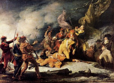 Bradddock, who was in the heat of the action the whole time, exposed himself at every poin. He had four horses killed under him as for nearly an hour and a half he rode amid the disintegrating ranks. By mid-afternoon with nearly three-quarters of his troops wounded or dead, he gave the order to withdraw. As drums sounded the signal, the men lost little time in retreating down the road. No sooner had Braddock mounted the fifth horse, than he was shot through the right arm, the missle passing into his lungs. The wound was mortal. As he was carried to the rear, he kept moaning, "Who would have thought it?" He died later muttering, "We shall know better know how to deal with them another time." The victory and the defeat were decisive. The three hours of mass murder took a terrible toll on the redcoats. Loss of British life was immense. Four hundred and fifty-six killed and 520 wounded out of a force of 1469. French-Aboriginal losses totalled 22 killed and 16 wounded out of 891. The British frontier remained at the Alleghanies and the French continued to occupy the whole of the Ohio Valley.